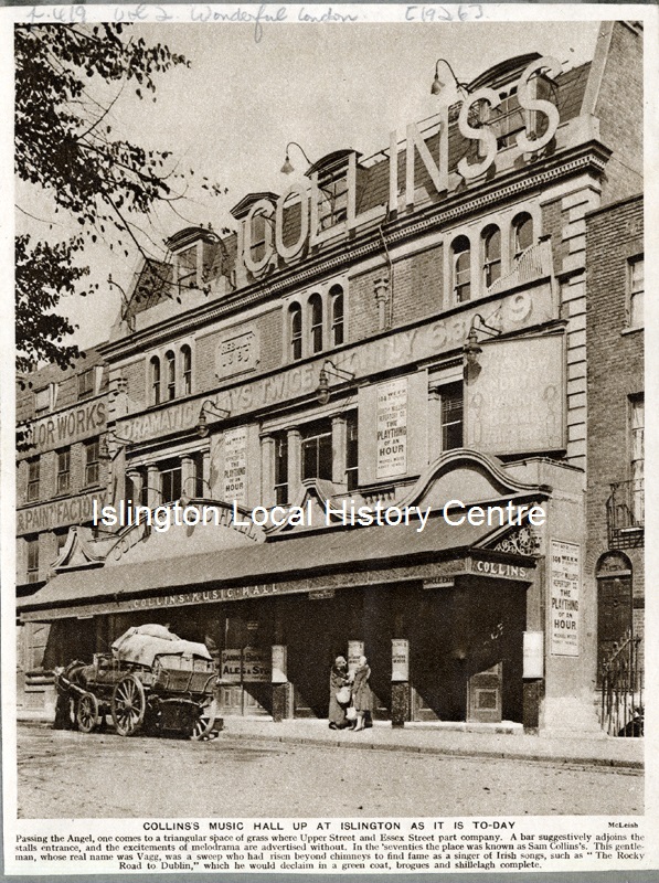 Collins Music Hall with a couple of women and a horse-drawn cart outside