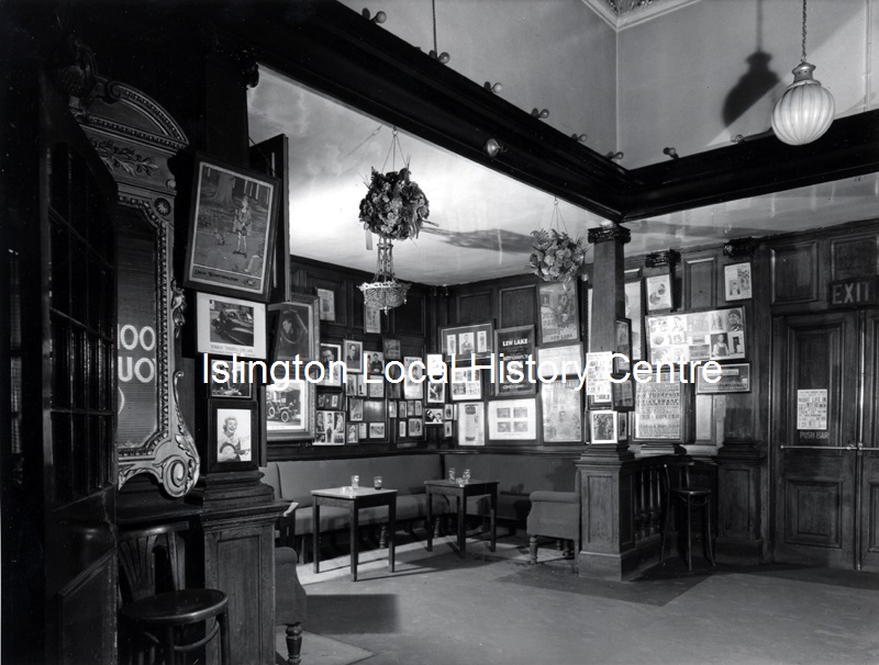 Deserted bar at Collins Music Hall, decorated with posters. The music hall burnt down in 1958, shortly after.