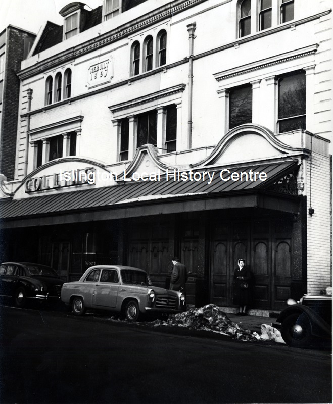 Exterior of Collins Music Hall on the Green with parked cars and fire damaged rubbish in front.