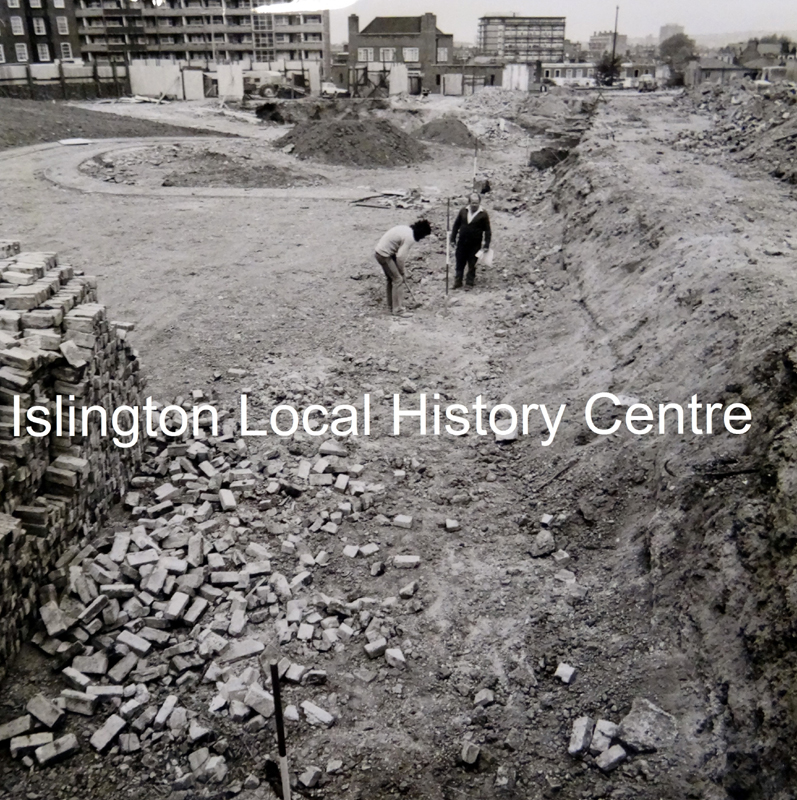 Works in progress in May 1974 for the extension to Barnsbury Park (renamed Barnard Park) new community playground, looking west towards George the Fourth pub.