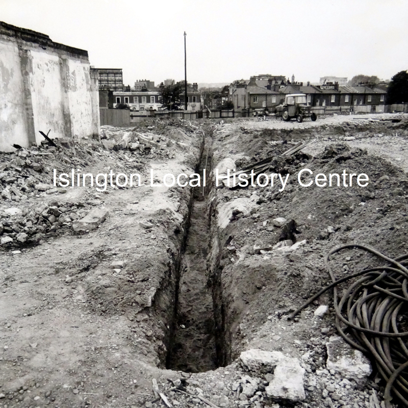 Works in progress in May 1974 for the extension to Barnsbury Park (renamed Barnard Park) new community playground looking west towards Hemingford Road.