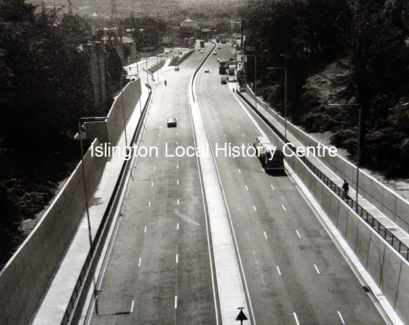 Metropolitan Principal Road (A1) 3 lane dual carriageway opened 30th April 1974, looking south towards Archway Intersection. Taken from Archway (Hornsey Lane) Bridge.