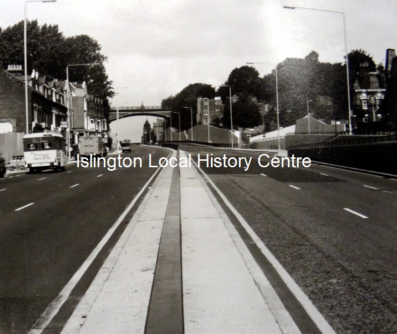 Metropolitan Principal Road (A1) 3 lane dual carriageway opened 30th April 1974, looking north towards Archway Bridge.