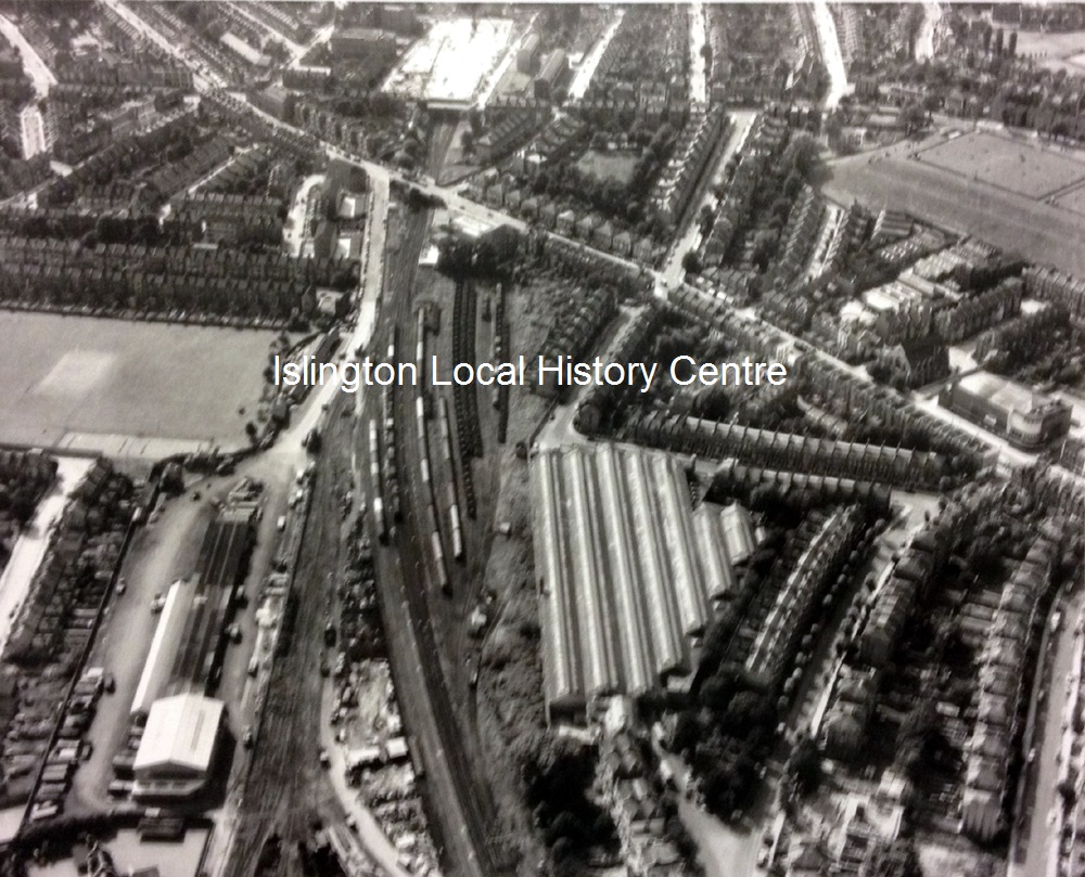 Aerial view of the disused Junction Road station looking south west with Tufnell Park playing fields on the left and Dartmouth Park on the right beyond the Congregational church and warehouse on Junction Road.