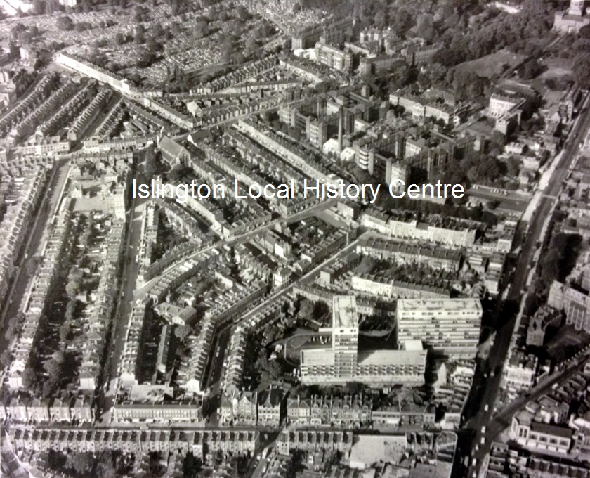 Aerial view of Archway looking north up Highgate Hill with Junction Road at the bottom and the old buildings of Whittington Hospital on the right.
