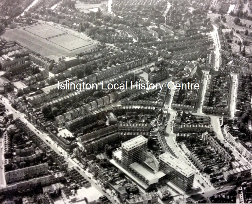 Aerial view looking south west from Archway with Junction Road bottom left, Dartmouth Park resevoirs above and Highgate Hill in the bottom right corner.