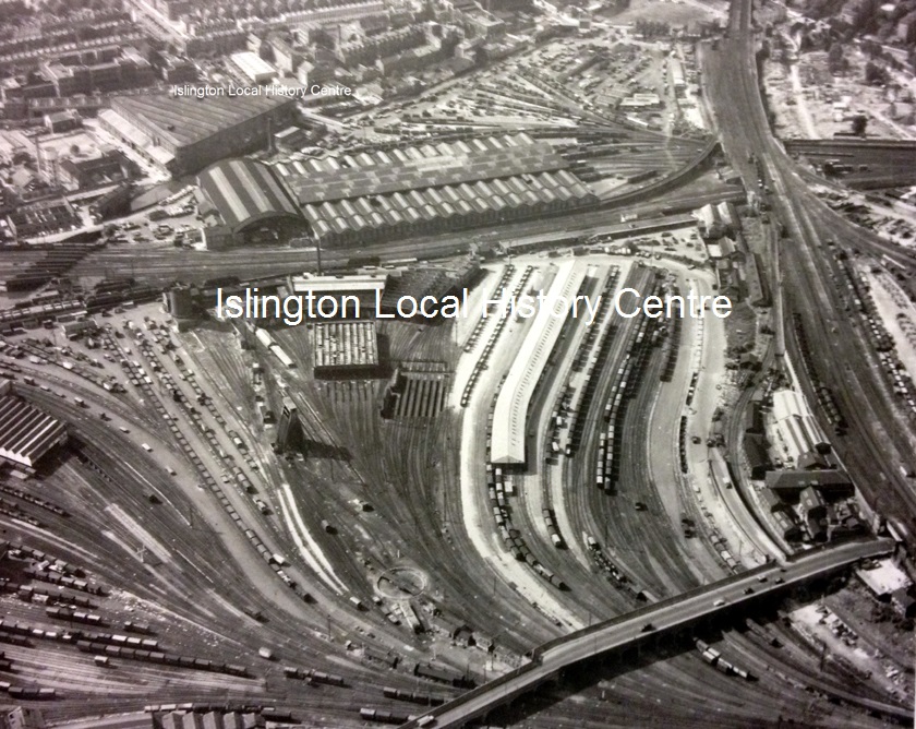 Aerial view across York Way looking West over railway lands and the viaduct.