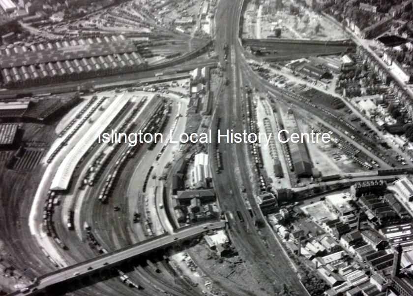 Aerial view across York Way looking West over railway lands and the viaduct.