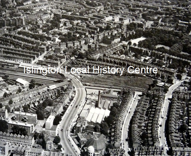 Aerial view east along Drayton Park from Islington Central Hall and laundry on the corner of Horsell Road.