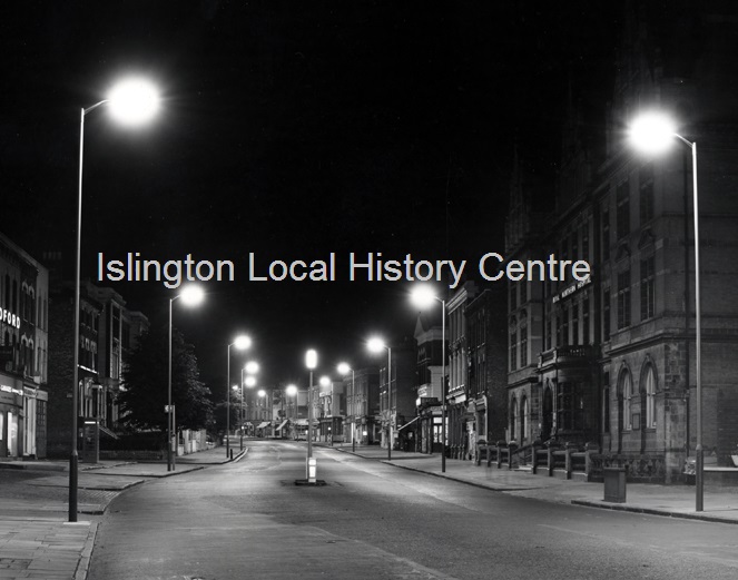 Looking north from the Royal Northern Hospital to show sodium lighting on Holloway Road, width 50 feet, 200 watt sodium, 30 feet mounting height, spacing 130 feet.