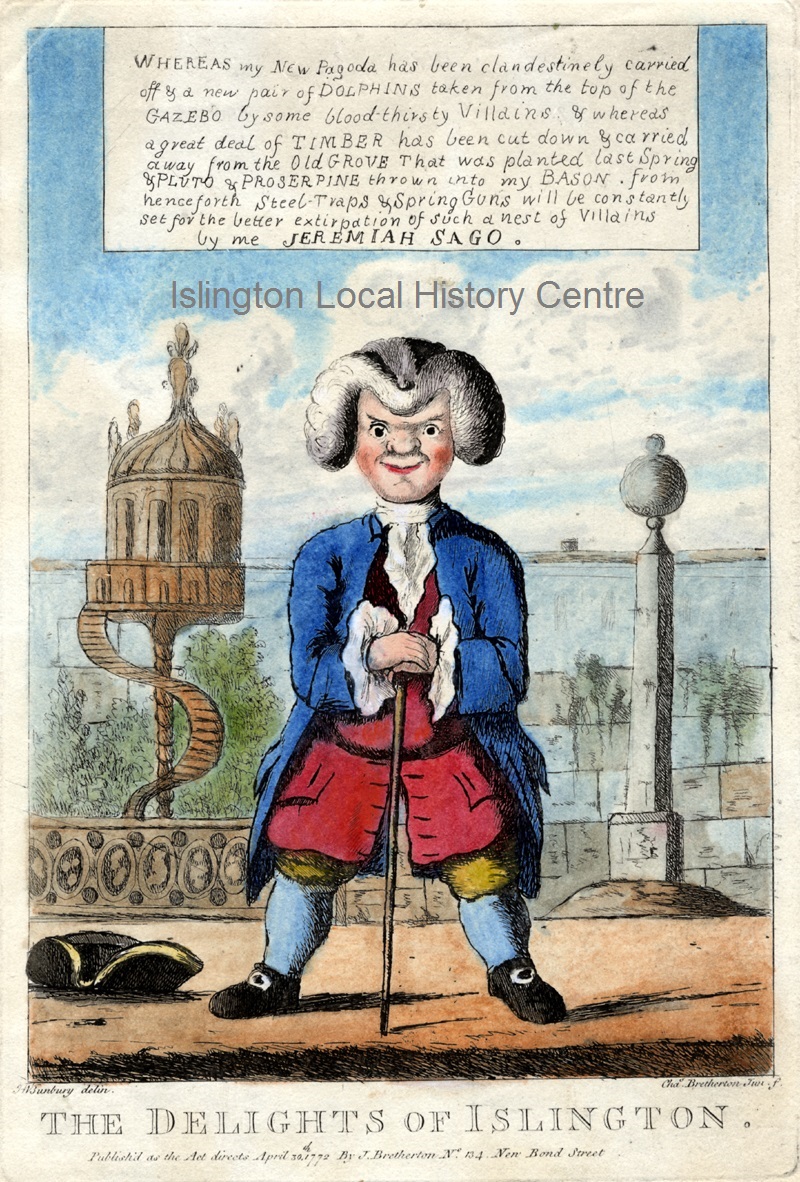 Jeremiah Sago before Sadler's Wells Pleasure Garden describes the measures he has taken to protect his residence from the 'blood-thirsty Villians [sic]' who have damaged and stolen the ornamental features of his house.