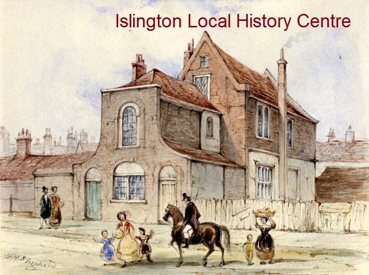 Street scene outside the school which Dame Alice Owen built in 1608 on 'Ermytage' field with a free chapel, and almshouses which stood till 1840.