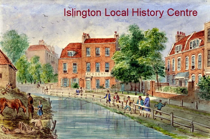 A lively scene in Colebrooke Row c.1800 of men fishing in the New River beside an Academy school and nos. 56 & 57 Colebrooke Row which were built before 1768. Boys taunt Baron Aguilar who 'had on the west bank of the New River a Starvation Farm, whose lean and emaciated livestock (shown) was notorious.'