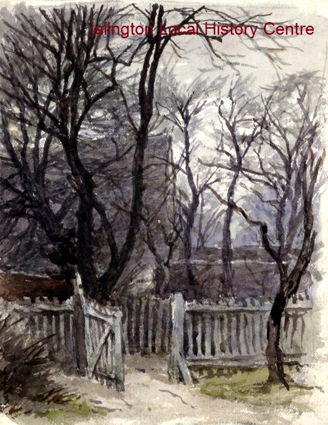 Winter scene of gate and picket fence in Canonbury Road before redevelopment