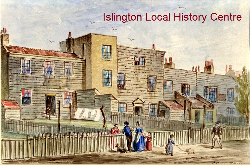 View of daily life in Anglers Gardens on Frog Lane (demolished 1872? for Popham Road), Georgian terraced houses with fenced gardens in front, one with washing on a line.