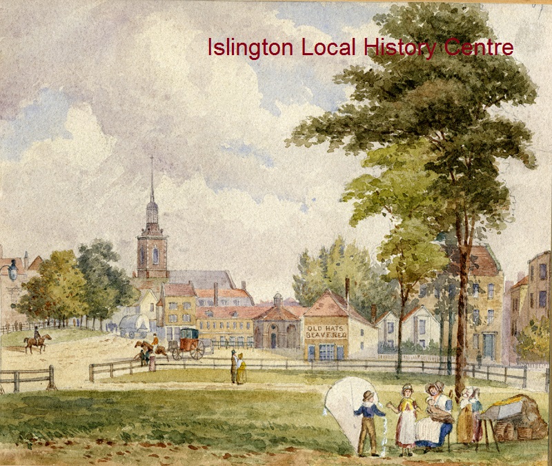 Upper Street looking North towards St Mary's church across Islington Green and the parish lock-up, on the right Islington High Street