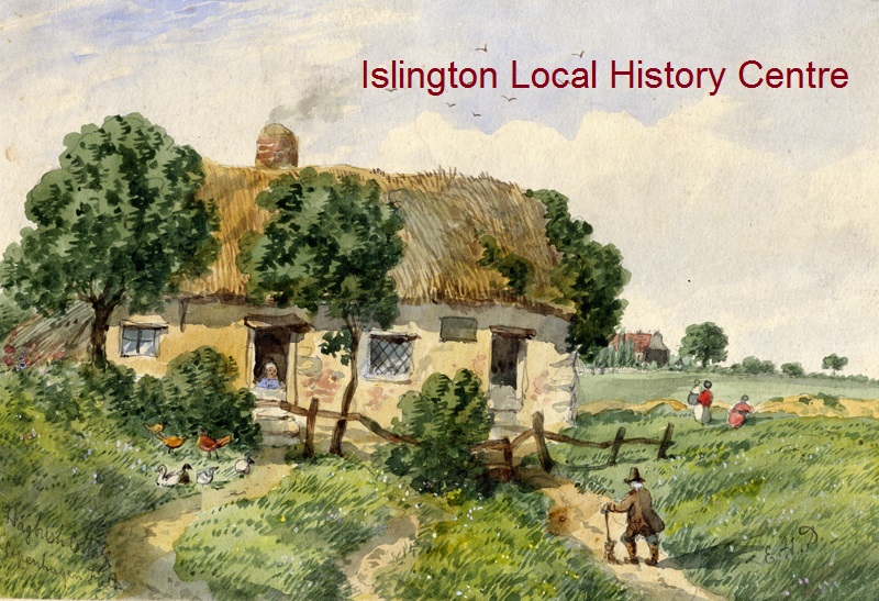 Hagbush Cottage opposite the Caledonian Asylum with Copenhagen House in the distance. This mud and thatch cottage lay between two rich landowners. William Corrall, a poor infirm labourer, his wife and child were 'lawlessly and violently ejected, and the cottage destroyed on the morning of 7th September 1827'.