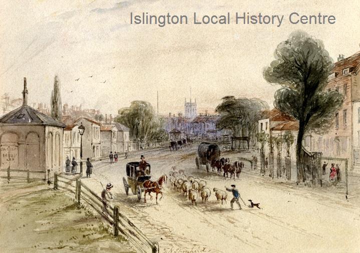 Lively scene on the corner of Islington Green with a view along a road, probably Islington High Street and Essex Road