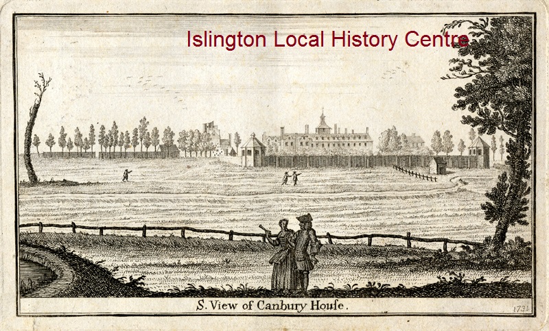 Canonbury House, built in 1509-32 by the Earl of Northampton and demolished in the early 19th century, is shown here surrounded by fields where a few people are walking.
