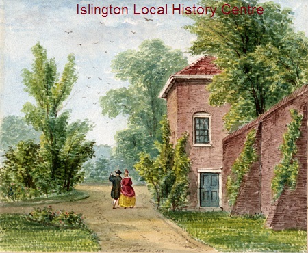 Corner of the garden at Canonbury where William Bolton Prior of St Bartholomew's Priory in Smithfield built his summer retreat in in the early 16th century (with an 18th century couple).
