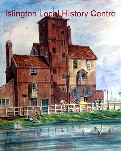 Canonbury Tower across the pond from the North with people relaxing or passing by and St Mary's in the distance.