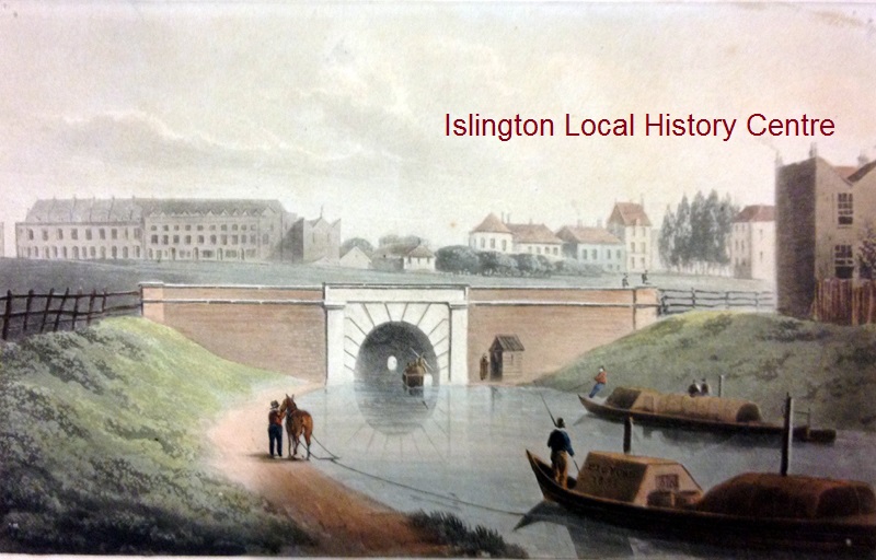 Horse-drawn canal barges by the mouth of the tunnel under Caledonian Road with White Conduit House in the distance and a terrace which must be an early section of Barnsbury Road
