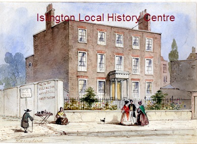 Former house of the vicar of Islington (died 1824, friend of Dr Johnson who frequently visited him at Islington') in Upper Street north of Almeida Street ('Dr Strahan's house opposite Cross Street & adjoining which Dr Pitcairn's house formerly stood, now open Wellington (Almeida) Street') with advertisement for Islington Institution on the wall.