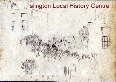 Sketch of view from Felix Terrace, renamed Liverpool Road 1869, perhaps showing the back of Cloudesley Square.