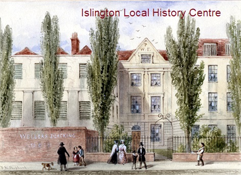 Busy varied street scene with a street trader and other locals outside the large walled early 17th century mansion built by Sir Thomas Fisher as his family residence, demolished around 1850.
