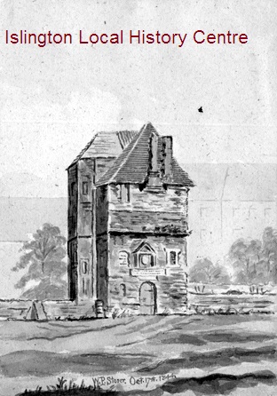 Fowler House, the mansion of the lords of Barnsbury was pulled down in 1850. At the end of the garden was Queen Elizabeth's Lodge, so-called because she may have passed through, but with the arms of Sir Thomas Fowler posthumously dated 1655. Very faintly in a wash behind can be seen a terrace of houses.