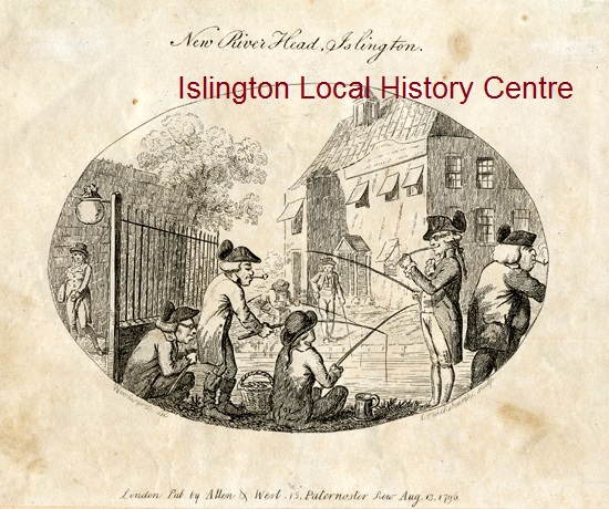 Oval showing a group of anglers smoking and fishing in the reservoir with the Sadler's Wells Theatre behind.