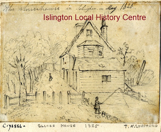 Fishing outside Highbury Sluice House on the New River (closed in 1874)