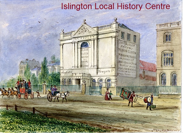 Street scene outside Palladian factory built around 1812 and taken over by Samuel Ridley in 1829 for floor coverings and in 1893 for Probyn's bottled beer depot (later Islington Planning Department, now flats). Ridley's bow-fronted Regency villa can just be seen beyond.