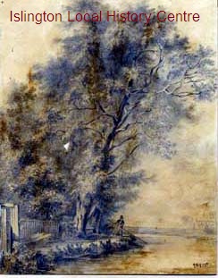 Rural scene of man fishing with net under huge tree in Balls Pond with St Paul's church (1828 Charles Barry) and houses in the distance