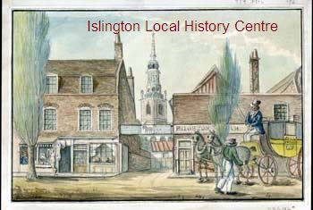 Brighton coach standing outside shops at the entrance to Jewk's Livery Stables with St Mary's church behind.