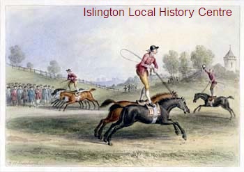 Spectators watch Johnson and two other performers standing on the backs of one, two and three galloping horses behind The Three Hats inn (near the Turnpike Gate, at the corner of Liverpool Road and Islington High Street)