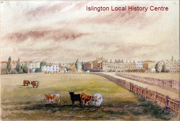 Cattle grazing in the North West corner of Highbury Fields looking west towards the Nag's Head along Camden Road. The chimneys of Holloway Prison can be seen rising above a row of terraced houses.
