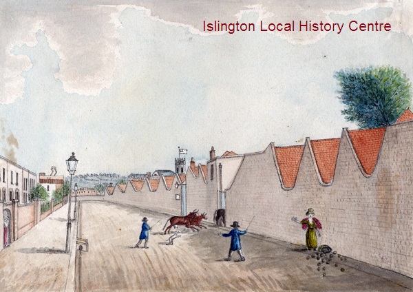 Herding bulls back in through the Liverpool Road side entrance to Laycock's Dairy and Cattle Layers run by Richard Laycock, one of the largest dairies in the country. A woman, surprised by the activity, has dropped her vegetable basket.
