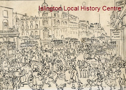 Cartoon of the hugely crowded junction at the Angel, (looking north from St John Street) a busy transport hub with lines of omnibuses turning into Pentonville Road and pedestrians struggling to cross past the traffic.
