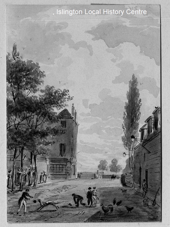 Children playing with dog and chickens in the road beside people by the pleasure gardens and open fields behind.