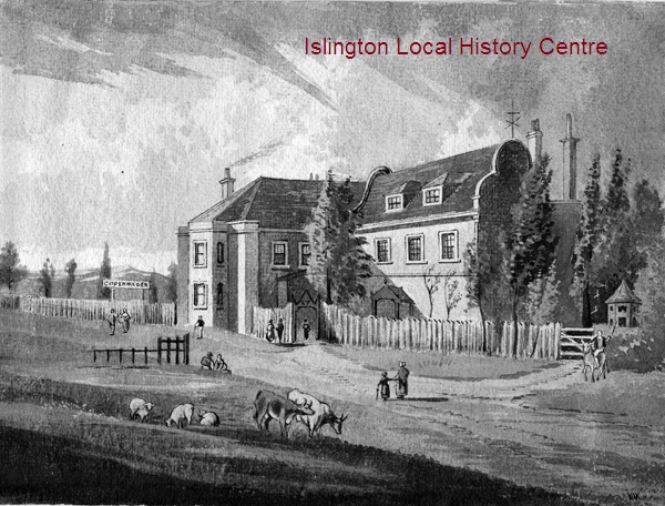 Copenhagen House with visitors approaching the house past the pond and animals grazing in the fields.