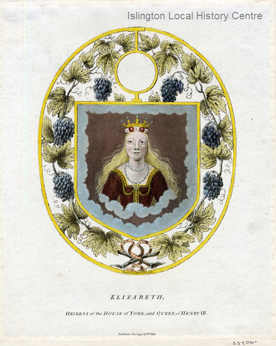 Print of stained glass bearing the arms of the Mercers Company from a window in the old Crown Inn (once a private residence on Lower Street now Essex Road). The head of a crowned woman issuing from the clouds was once believed to show Elizabeth, queen to Henry VII, and the print gives this attribution.
