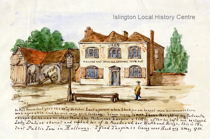 Tavern dated 1604 and captioned 'In this house last year 20th October I met a person whom I took for an honest man, his conversation was agreeable and he was very good looking. Since many times I have thought of my fortunate escape for he was no other than the notorious Turpin. A little after he left me he stopped Lady Dalins chariot and robbed her of £12 and her watch and rings. This is the last public inn in Holloway. I find Turpin is living near Hackney. 8th May 1731'.