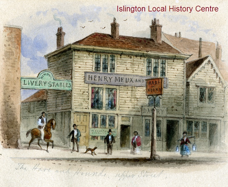 Busy street scene outside Hare and Hounds timber pub building with Henry Meux sign and livery stables, Upper Street site opposite present Town Hall.