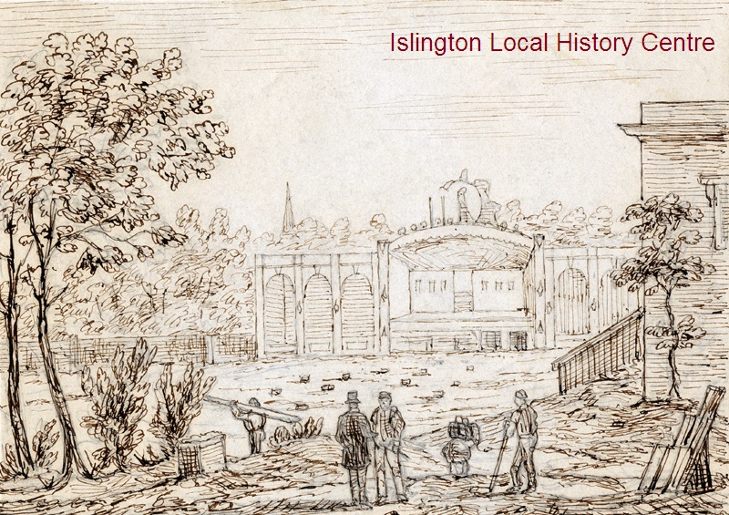 Pen and ink drawing showing demolition of Highbury Barn after bawdy behaviour lead to a court case and the authorities revoked its dancing licence. Workmen dismantling the open-air dancing platform. The gardens were built over by 1883.