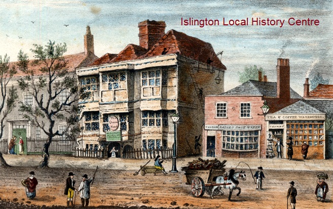 Lively street scene outside the 17th century wood and plaster building (landlord W.Goodall) with adjoining houses, shops and passersby. The pub was demolished in 1829 and it look as if the start of this could be in progress with workmen on the roof