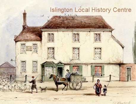 Sheep being herded past the Old Pied Bull Inn on the corner of present day Theberton Street, demolished 1830, believed to be the scene of Sir Walter Raleigh's servant pouring water over him to extinquish the smoking tobacco from his pipe