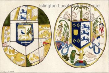 Stained glass windows (with arms of Sir John Miller?) from the parlour of the Old Pied Bull Inn on the corner of present day Theberton Street, demolished about 1827. Traditionally known as his residence or the scene of Sir Walter Raleigh's servant pouring water over him to extinquish the smoking tobacco from his pipe
