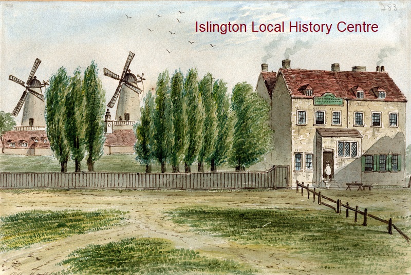 Rosemary Branch Tavern (built 1783 Shoreditch/Islington boundary) with the white lead works (and the windmills which powered it) beyond.