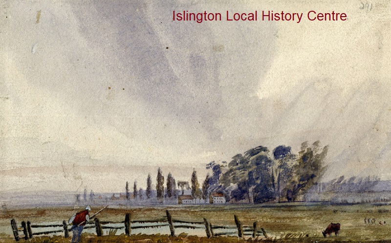 Rural view of the tavern surrounded by trees in the distance, with a pond across the fields in the foreground